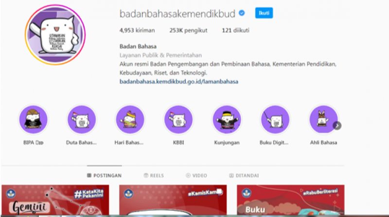 Saat ini, Instagram Badan Pengembangan dan Pembinaan Bahasa memiliki 253.000 pengikut. Setiap hari lembaga pemegang amanah UUD No 24 Tahun 2009 ini menyajikan konten kebahasaan dan kesastraan dengan sajian visual yang sedap dipandang mata. Adapun konten rutin yang disajikan tersebut adalah sebagai berikut.