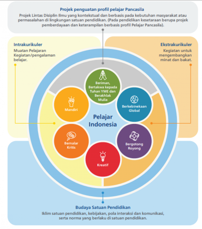 Profil Pelajar Pancasila (selanjutnya disebut P3) mengambil intisari dari kutipan “pelajar Indonesia merupakan pelajar sepanjang hayat yang kompeten, berkarakter, dan berperilaku sesuai nilai-nilai Pancasila”. Pembelajaran ke depan mampu mendorong peserta didik berpikir dan bertindak berlandaskan Pancasila. Selain itu juga, siswa didampingi guru atau pamong untuk melihat perubahan-perubahan sehingga menjadi pribadi yang terampil pada setiap model perkembangan zaman. Terdapat enam dimensi Profil Pelajar Pancasila, yaitu 1) beriman dan bertakwa kepada Tuhan Yang Maha Esa dan berakhlak mulia; 2) mandiri; 3) bergotong-royong; 4) berkebinekaan global; 5) bernalar kritis; dan 6) kreatif. Jadi, profil pelajar Pancasila adalah karakter dan kemampuan yang dibangun dalam keseharian dan dihidupkan dalam diri setiap individu peserta didik melalui budaya satuan pendidikan, pembelajaran intrakurikuler, Proyek Penguatan Profil Pelajar Pancasila, dan ekstrakurikuler. Adapun korelasi beberapa komponen tersebut dapat dilihat pada gambar berikut ini.