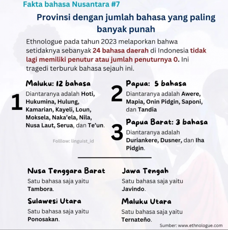 terdapat 24 bahasa daerah di Indonesia yang tidak lagi memiliki penutur atau jumlah penuturnya 0. Hal itu menjadi rapor