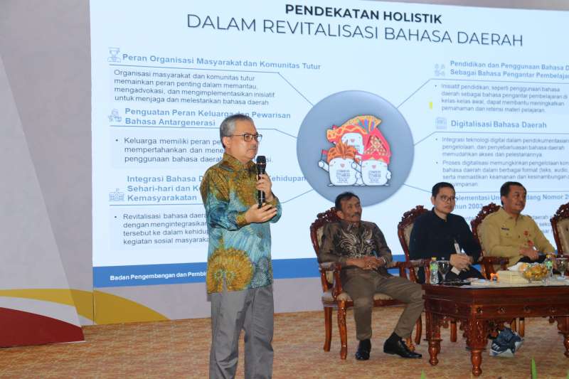 Kepala Badan Pengembangan dan Pembinaan Bahasa (Badan Bahasa), E. Aminudin Aziz, hadir sebagai narasumber dengan materi bertajuk “Arah Baru Revitalisasi Bahasa Daerah: Menekan Laju Kepunahan Bahasa Daerah di Indonesia”. Aminudin menjelaskan bahwa ancaman kepunahan bahasa daerah semakin nyata. Menurut UNESCO, satu bahasa punah setiap dua minggu. Indonesia, dengan 718 bahasa daerah dari Aceh hingga Papua, berada dalam ancaman ini. “Selama sepuluh tahun terakhir, bahasa Sunda kehilangan dua juta penuturnya, jumlah yang setara dengan populasi Provinsi Bengkulu,” ungkap Aminudin.
