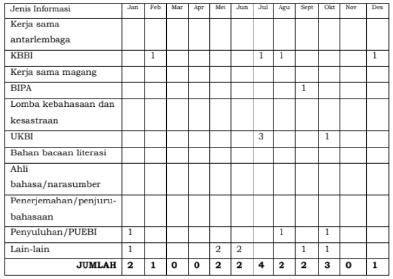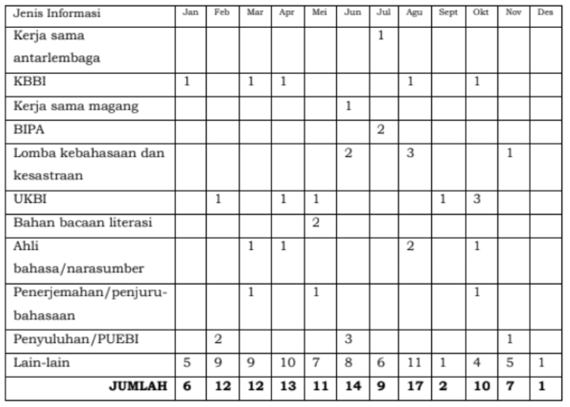 Jumlah pemohon informasi kepada Badan Bahasa baik melaui Pos-el dan media sosial sejak 1 Januari sampai dengan 31 Desember 2024, berjumlah 374 pemohon. Dari 374 permohonan tersebut, permohonan masyarakat melalui pos-el Badan bahasa diminta sebanyak 189 permohonan, sedangkan melalui media sosial yang dikelola Badan Bahasa sebanyak 166 permohonan dan melalui formulir permohonan informasi sebanyak 3 permohonan, serta dari aplikasi SP4N-Lapor sebanyak 16 permohonan. Secara substansi, permohonan informasi tersebut mencakup.