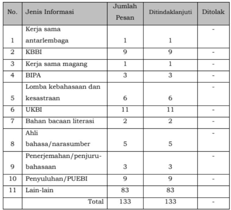 Jumlah Pemohon Informasi periode Januari hingga Desember 2024 yang dikirimkan masyarakat melalui layanan dalam jaringan yang meliputi Pos-el, media sosial, dan luring berjumlah 133 permohonan terkait layanan dan produk kebahasaan dan kesastraan yang ada di Badan Bahasa. Rincian permohonan tersebut dapat dilihat pada tabel berikut..