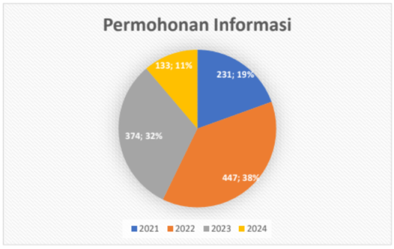 Berikut adalah perkembangan jumlah permohonan informasi publik ke PPID Badan Pengembangan dan Pembinaan Bahasa Tahun 2021—2024.